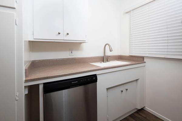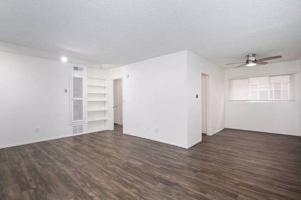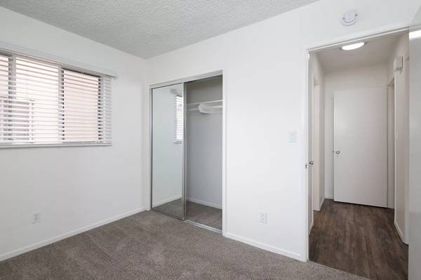 Emerald Manor Apartments offers a mid-century style and a convenient Pacific Beach location. This particular 2 bedroom, 1 bathroom unit is a 2nd floor corner apartment with vinyl plank flooring, carpet in the bedrooms, a dishwasher, mirrored closet doors, a built-in bookshelf, and more.