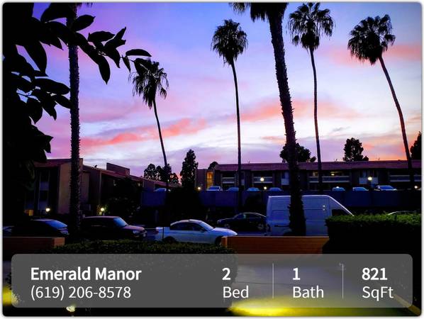 This highly desirable location is in the heart of Pacific Beach, right down the road from coffee shops like Starbucks & Better Buzz, Trader Joe's, Vons, great restaurants, and PB's popular nightlife as well as easy access to I-5, I-8 and 52 Freeways. Sail Bay and the beach are just 1.5 miles down the road. Grab a bite to eat from a spot on Garnet Ave. and head over to Fanuel Park or Kate Sessions Park to enjoy the bay views. With so much to see and do nearby, we are sure you will love calling Emerald Manor Apartments your new home. Call or visit us today!