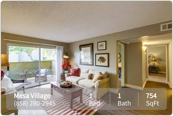 Description: Welcome to the Hidden Gem of Mira Mesa, The Mesa Village Apartment Community, where an urban lifestyle and luxury blend to offer you a wonderful place to call home. Our community offers you a world of convenience both on and off the property. Commuting is made easy with nearby access to major highways.