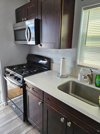 Fully Furnished Kitchen: Fridge, gas stove/oven, microwave, coffee maker, pots/pans, dishes – everything but the dishwasher.
