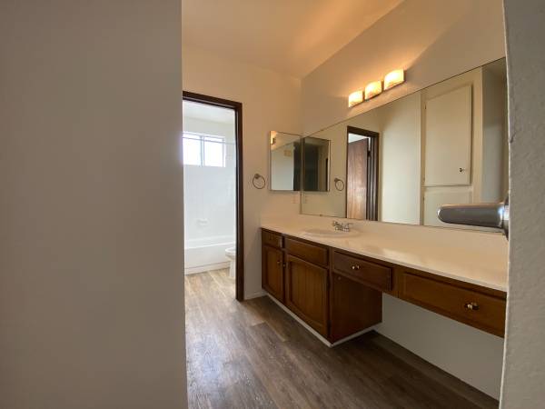 The bathroom has a beautiful vanity located just outside the tub/shower.