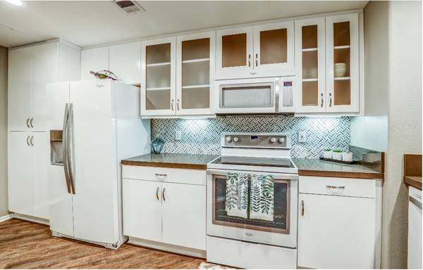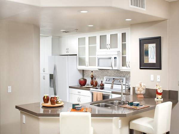 Designer Kitchens with Quartz Counters, Designer Back-Splash, and Glass Inlayed Euro Style Cabinets*