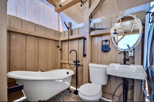 Bright, modern, and move-in ready. A full-length pergola doubles your living space with a private deck and patio lights. Enjoy two full bathrooms (remodeled indoor bath + outdoor cast-iron clawfoot soaking tub). All-electric kitchen, fully plumbed to sewer/electric (no gas). Best for one individual, but can sleep two (two twin beds + sofa). Limited storage—ideal for minimal living. Includes Wi-Fi, TV, and shared washer/dryer steps away. Quiet, fenced yard; property includes locked, gated access with a keypad code and gate opener for added security and privacy.