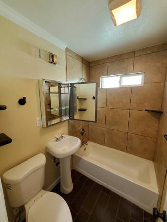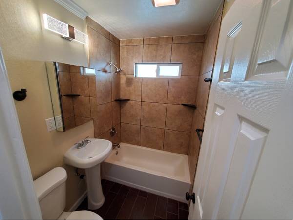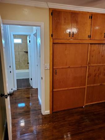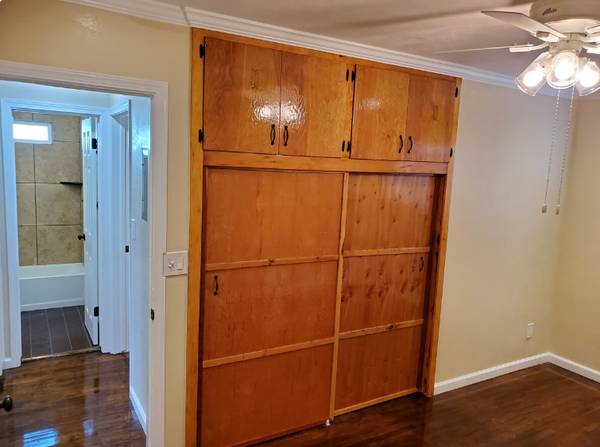 Original Hardwood floors in living room, hallway and bedrooms. Beautiful porcelain tile in bathroom and kitchen. Bathroom also has custom towel holders/hooks, built in shelves/nook. Crown molding throughout house. Nice sized closets with stylish barn sliding doors in bedrooms, and ample storage in hallway. Ceilings fans and recessed lighting on dimmers in bedrooms and living room. Modern upgrades include: USB Port Outlets, Popup cell phone charger in counter designed for a desk.