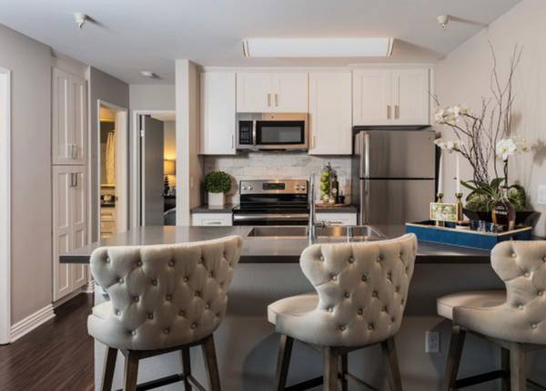 Residents can enjoy garage parking, sleek stainless appliances, and a fully updated kitchen featuring quartz counters and a marble backsplash, all within a designer interior. The community boasts a resort-style pool and lounge area with private cabanas, creating a relaxing atmosphere for relaxation and social gatherings. The apartments, available in studio, one, and two-bedroom layouts, are thoughtfully designed with luxury features and large balconies that extend the living space outdoors.