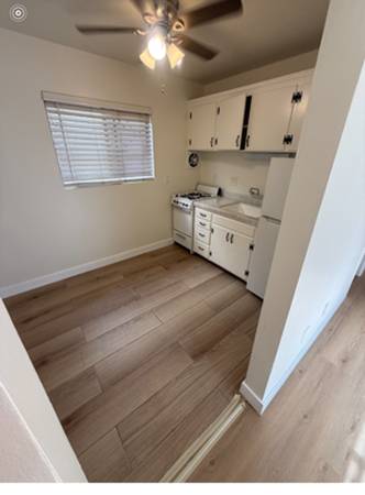 The kitchen offers a refrigerator, stove and a great many cabinets for a studio apartment. It has a ceiling fan and a large window for natural light.