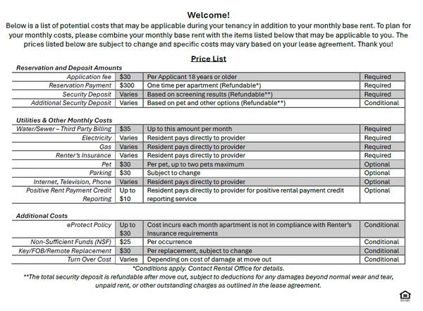 Price shown is Base Rent. Residents are required to pay the following: Application Fee ($30.00 Per Applicant 18 years or older, One-Time, At Application), Reservation Payment ($300, One time per apartment, Refundable*), Security Deposit (Varies, Based on screening results, Per Apartment, Refundable**), Additional Security Deposit (Varies, Based on pet and other options, Refundable**, Water/Sewer (Up to $55 per month per apartment, Utility, Usage Based, Nonrefundable), Recycling ($2 per month per apartment, if applicable, Nonrefundable), Electricity/Gas (Varies, Usage Based, Utility, Resident pays directly to provider), Renter’s Insurance (Varies, Resident pays directly to provider). Optional charges that may be applicable to the resident are as follows: Pet ($30 Per pet per month, Up to two pets maximum, Nonrefundable), Parking/Carport/Garage/Storage (Varies per property, per month, Subject to change, Nonrefundable, Refundable** deposit may apply), Internet, Television, Phone (Varies, Utility, Resident pays directly to provider), eProtect Policy ($8.95, Cost incurs each month apartment is not in compliance with Renter’s Insurance requirements, Nonrefundable), Non-Sufficient Funds (NSF) ($25 Per occurrence, Nonrefundable) Key/FOB/Remote Replacement (Varies per property, Per replacement, Subject to change, Nonrefundable), Positive Rental Payment Credit Reporting ($2.00 per month per resident, Resident pays directly to CredHub, Nonrefundable), Turn Over Cost (Varies, Depending on cost of damage at move out). *Conditions apply. Contact Rental Office for details. **The total security deposit is refundable after move out, subject to deductions for any damages beyond normal wear and tear, unpaid rent, or other outstanding charges as outlined in the lease agreement.