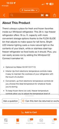 Refrigerator not cooling. Bought at Costco, used less than 3 years. Good for repair or parts. No longer needed