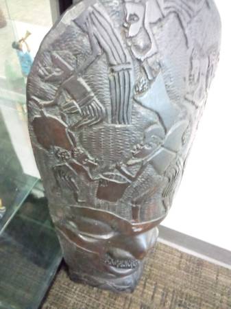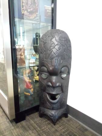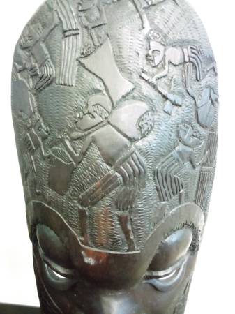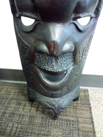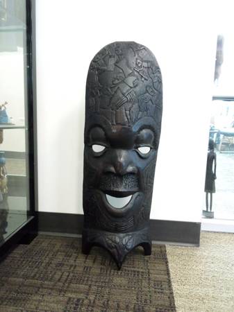 A One-of-a-Kind, handcarved Mwana Pwo Chokwe mask handmade by artist in Angola. This mask resembles a human with slit eyes, a sharp nose and broad lips. The face features traditional scarification marks on the forehead and cheeks as symbols of beautification.