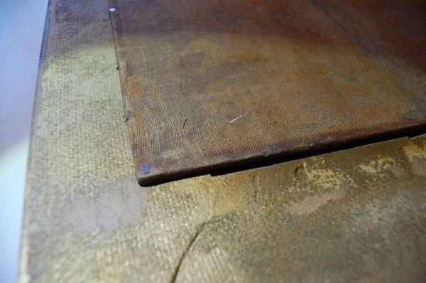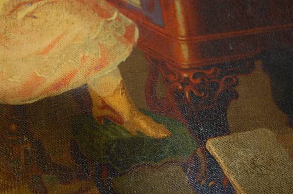 It is almost certain that this painting has been retouched at some point. There are some strange washes of color especially on the hand, forehead, and back/shoulders/chest that have a slightly different finish (gloss) when illuminated from the side. These areas where the finish does not appear lacquered over also include some areas on the drapery of the dress, the foliage surrounding the fish bowl, the urn that rests on the mantle, and the odd washes of grey and brown that adorn the wall right and left of the figure. These all center somewhat on the aforementioned 'cracks' in the varnish. These should be pretty apparent in the photos. I would say there are three: one that runs the entire width from the top surface of the 'piano', through the hand and over to the fish bowl, a second that runs back through the figure's shoulder and terminates near the sheet of music, and a third that returns to the top area of the fish bowl passing through the forehead. I would guess that a crack occurred that required the retouching of the painting by a less-expert hand since all the retouching occurs in this 'Z'-shaped area of cracking.