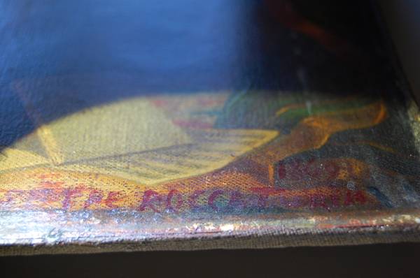 As you can see I have spent some time trying to get to the bottom of this. The provenance of the piece at auction provided no more than I have related here. I see the date of 1869 on the folio depicted in the painting and it is possible the caption is a later addition to the painting with the date culled from there. There are no other clues that I can add. Certainly the style of the painting, the dress, the pose and the decor of the room will give an expert a clue. The board or panel that the painting are on could help to date it as well. The frame, like I said, is not original and is for an 11.25 x 15.5 inch painting and this painting is 14 x 17. It has been nailed to the frame with small brads. I was able to pull them out easily enough by hand to photograph the last obscured portion on the lower right where the date and the word 'Turin' appears.