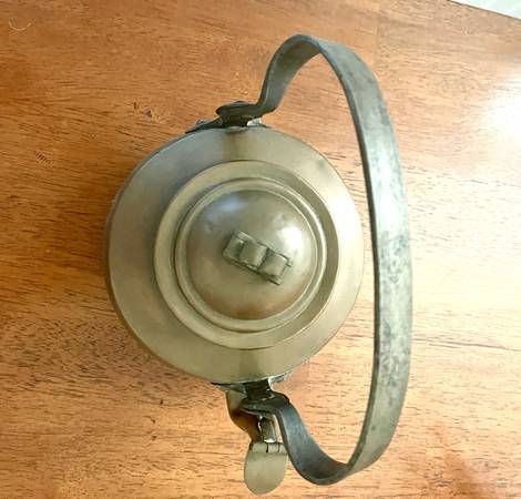 Old copper kettle with copper lid and handle. Intriguing design with clever hinged cover on tip of spout.