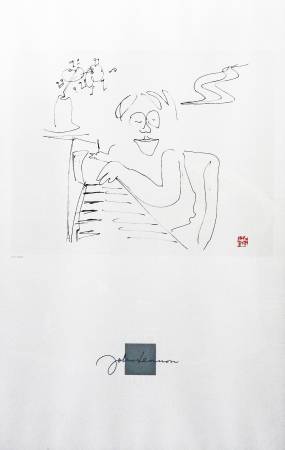 John Lennon (1940-1980, British) “BABY GRAND” limited-edition lithographic print after the original 1970 ink self-portrait that is a drawing of himself composing music and song while sitting at the white baby grand piano in the living room of the Lennon home at the Dakota apartment building in New York. Creative ideas in the form of musical notes from flowers seem to flow into his head from a hat sitting atop the piano. The joyful work of art features a chop mark stamp in red and reads, in Japanese, "Like a Cloud, Beautiful Sound." It is numbered 4543/5000 in pencil in the lower left and an embossed blind stamp seal consisting of his name and a reproduction of his signature on transparent green foil ink is centered under the image. The work of art is 37 x 25 inches and unframed.