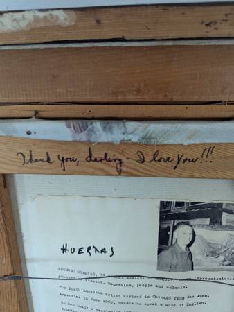 Provenance: Includes a typed biography of Segundo Huertas from "Arts International, Ltd." attached to the back of the frame, along with a photograph of the artist. There is also a handwritten inscription on the back of the frame that reads "Thank you, darling - I love you!!!" and another inscription "Gerry - Happy Birthday, January 15, 1971. My blood for you, like the petals in this picture, shall never wither for you. Mel."