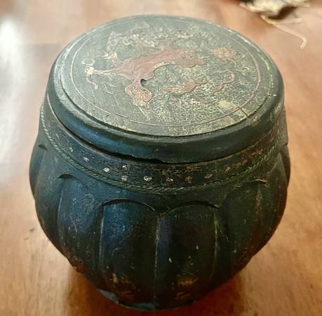 Intricately shaped, carved wooden pumpkin pot; lid decorated with a dragon or lion. Probably Chinese. Exquisite craftsmanship. Perfect as conversation piece or perfectly sized to hold spare roll in...