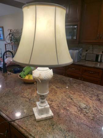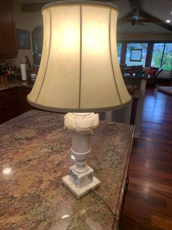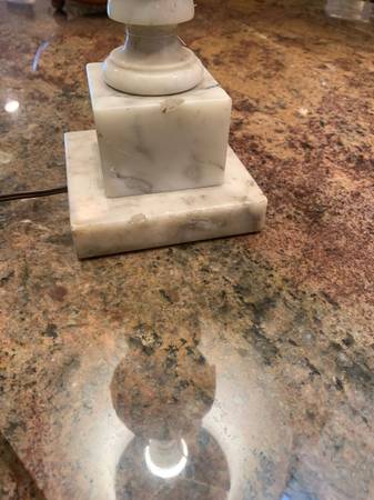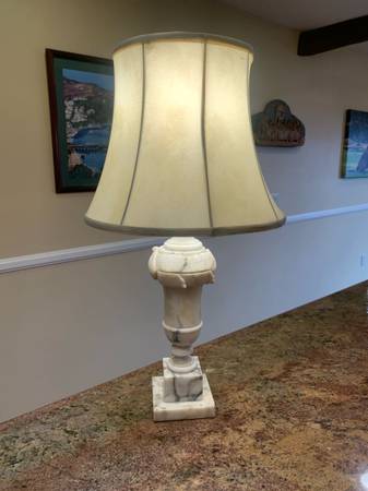 Italian white marbled alabaster table lamp. Vintage and sometimes named pineapple lamp. A few small chips that are hardly noticeable. Great condition for its age. 27”high including shade base is 4.5...