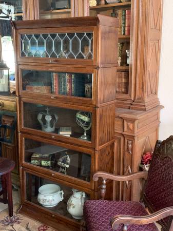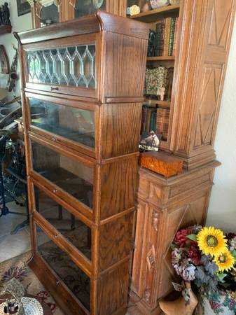 Antique 5-Tier Oak Barrister Lawyer Bookcase. Classic barrister style with multi-tier design and five lift-and-slide compartments with glass doors. Top compartment has original decorated leaded glass.This beautiful vintage quarter-sawn oak bookcase is in excellent condition and perfect for books, collectibles, or display pieces. Dimensions are: 73" high x 35.5" wide x 11.5" deep. Purchased many years ago at La Marina Antiques, Ltd. in Dana Point. A timeless and functional piece with a touch of vintage charm. $500