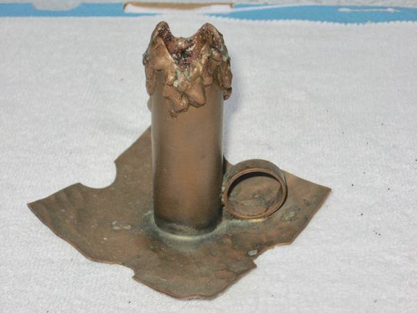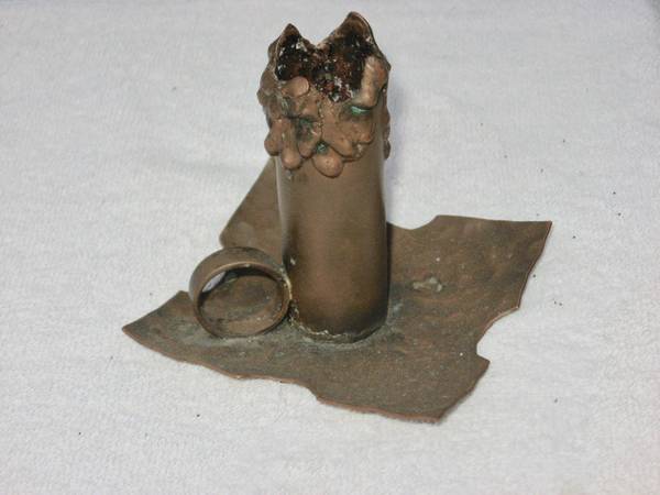 Finger held hand peened copper candle holder with old patina could be polished to a nice sheen if so desired.