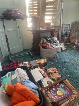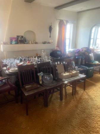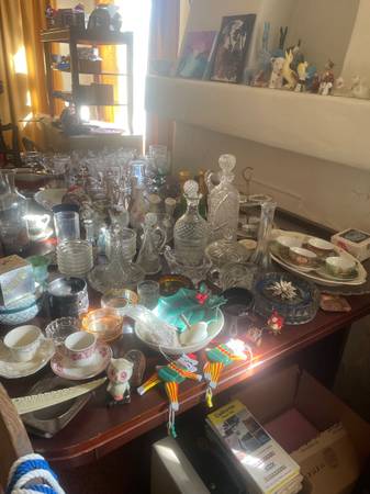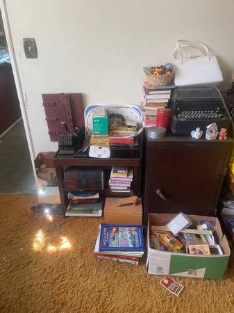 All must go sat cash only 9 to 2 half price at 4448 Felton street off Meade house is packed two antique dining tables dressers art deco vanity’s two of them two antique safes we have the combo vintage clothes jewelry books stamps vintage paper crafts China crystal reel to reel typewriters pottery glass wood frames garage is packed