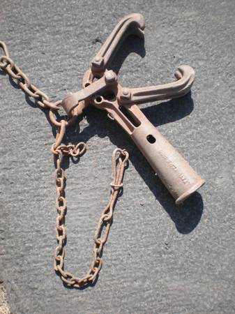 The true function of this heavy device is still a mystery. We believe it may have originated in the logging industry. The hooks are clearly for chains used as snubbers and the long conical socket was likely put at the end of a spar or gin pole all for lifting something heavy. Offered at $103 A verifieble positive identification will qualify for a modest discount. Have fun.