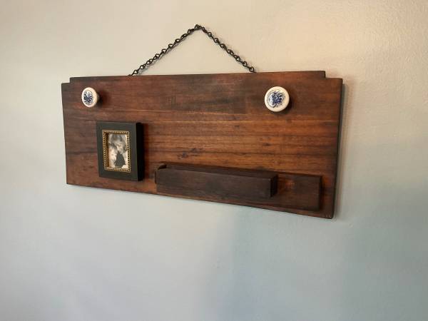 Rustic Shelf for sale. This piece was made from parts of a rescued antique treadle sewing machine cabinet. The little ledge was originally inside the cabinet to hold sewing necessities. Knobs (easily replaced to your liking) and small picture frame (also easily changed ) have been added to make it interesting. Could be used in a bathroom, entry or just about any room of choice!