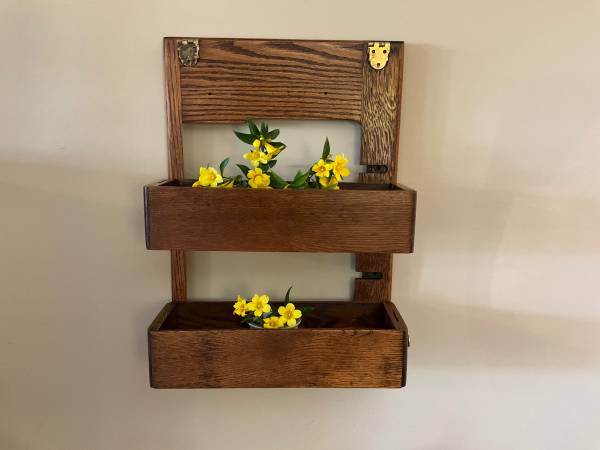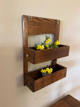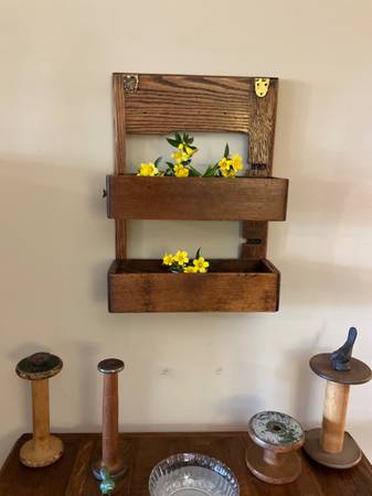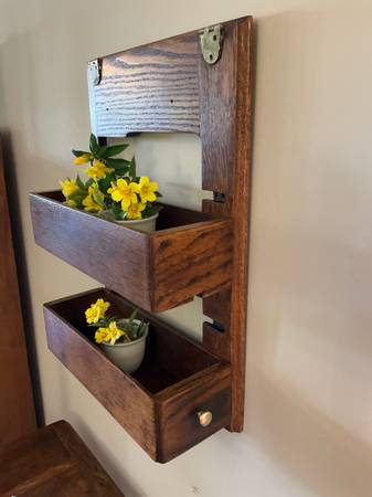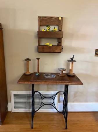 Shelf made from a restored antique treadle sewing machine for sale This unique piece was made from parts of a rescued worn down machine cabinet. The back is from the original top that held the actual sewing machine and the shelves are the storage drawers. Could be used for so many things! Perfect for extra storage in a bathroom or kitchen or for displaying fresh flowers or small houseplants. Knobs are not original but can be easily changed. Check my other listings for other parts (see pictures) made from the same machine.