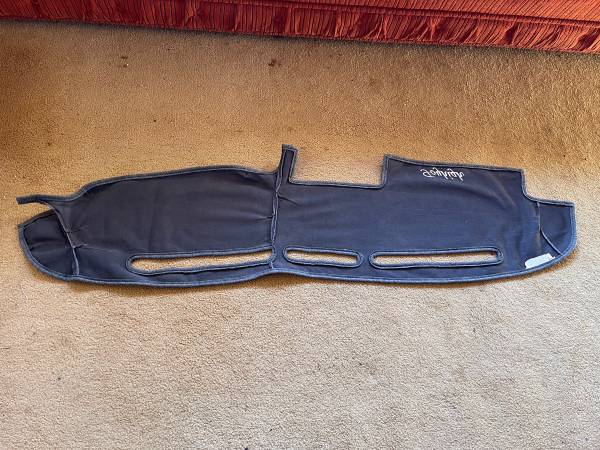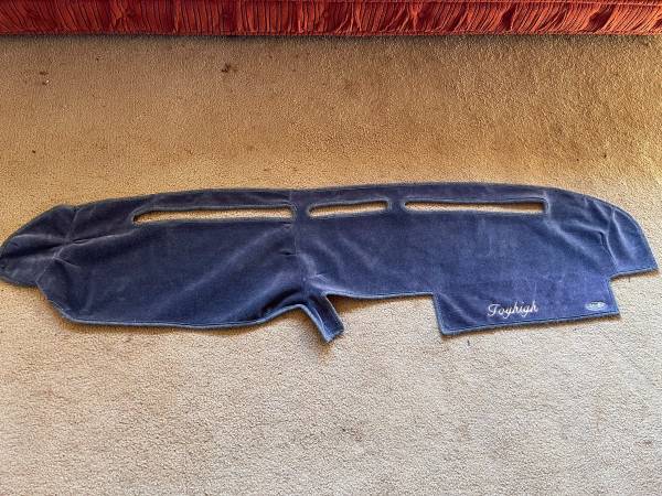Custom made for my 1985 Toyota Pickup Truck. VelourMat was the second generation mat. Smoother dash cover from the CoverCraft company. We ordered factory white scrolling letters for this one with “Toyhigh” scripted on passenger side Great for a lifted Toyota 4x4 truck Also could fit 2WD. Nice smooth gray feeling material. Covers, protects, warms and improves a cold plastic dashboard. Just requires double-sided foam pad tape to attach. Do not need anymore. See picture. Please text questions or comments. UTC area near Miramar. USA cash only Thank you