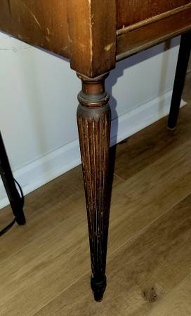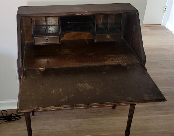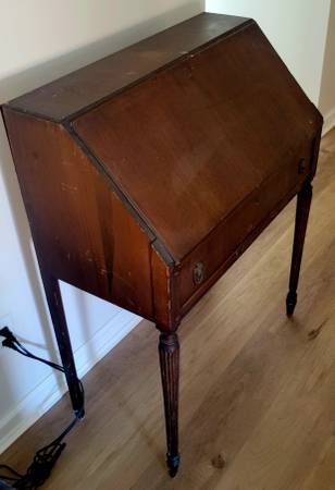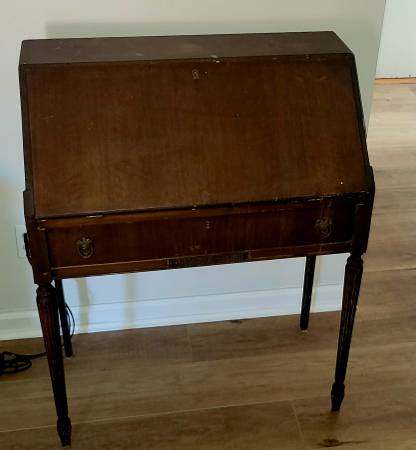 This Victorian style bureau desk has all original hardware and the front legs are tapered and fluted. Made from solid wood. It measures 29.5" wide, 16" deep, and 38" tall.