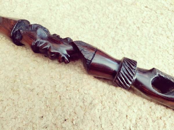 ` Vintage Ebony African Tribal Walking Stick, Hand-Carved - Antique? Possibly Maasai. With man's head above a standing Ibis. 36.5” long. 594 gm Very nicely carved. Smooth, strong, and heavy. $150...