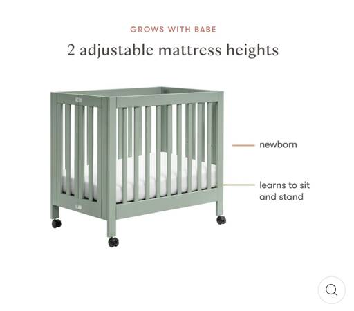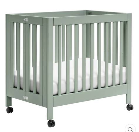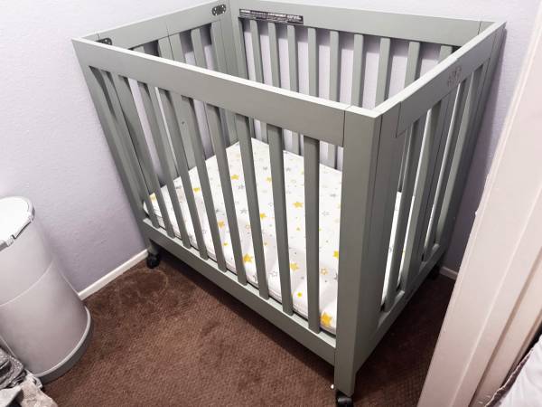 Crib in excellent condition. 2 height options. Folds for easy storage. Sage green color. We used it to go in our walk in closet that we converted into a mini-nursery and it worked perfectly. This...