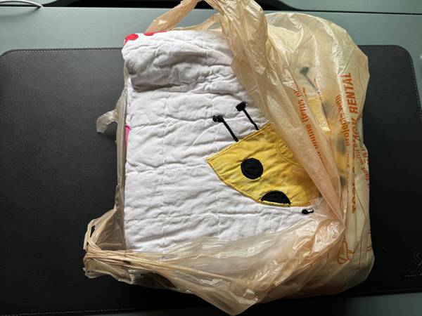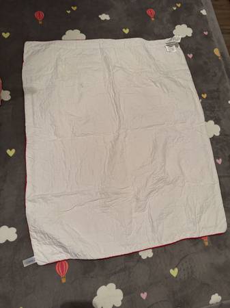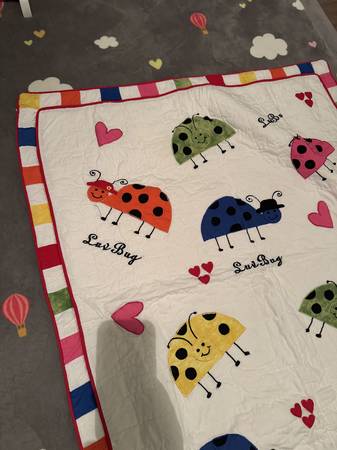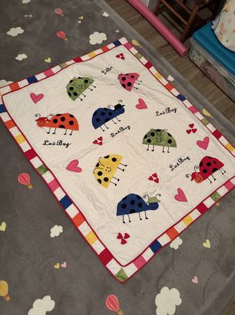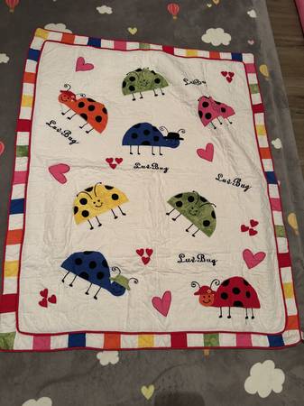 Our roommate is selling this sweet Luv Bug baby blanket. It has been used, but it is still a very cute, big blanket for little ones. She is moving out of state to AZ and needs every dollar she can get, so it is all yours. blanket is roughly around 33 1/2 inches wide X 42 inches tall. Coming from a pet free and smoke free home! You can come pick it up this week! Sorry, my camera skills are not the best.