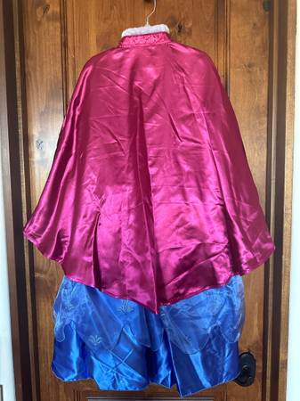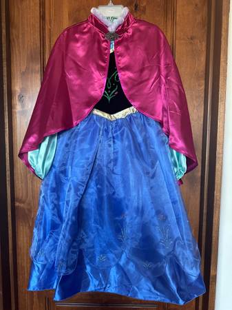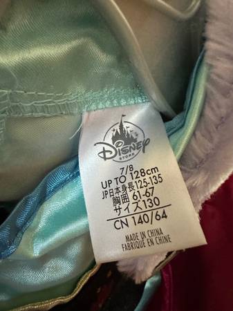 New w/out tags Disney Store exclusive Frozen, Anna, costume dress in size 7/8. Details of the dress include, a blue satin like fabric skirt with an organza overlay complete with glitter flowers, long aqua puff sleeves, black panne “velvet” bodice with glitter design and gold lame trim throughout. The removable burgundy “satin” like fabric cape has faux fur collar trim with a metal and stone detailed hook closure. Also, included is Anna’s matching crown. Please see below details from the manufacturer. This stunning dress is perfect the perfect addition to your collection for any Disney princess fan for Halloween, a party, photo shoot or pretend imagination play.