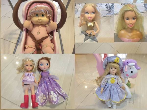 1 ● Cabbage baby doll with Graco swing in good condition. Sale for $15 2 ● Barbie heat and Brass heat. Both head doll sale for $8 3 ● All 3 dolls sale for $8 (Purple doll 14" + Sophia doll 10" +...