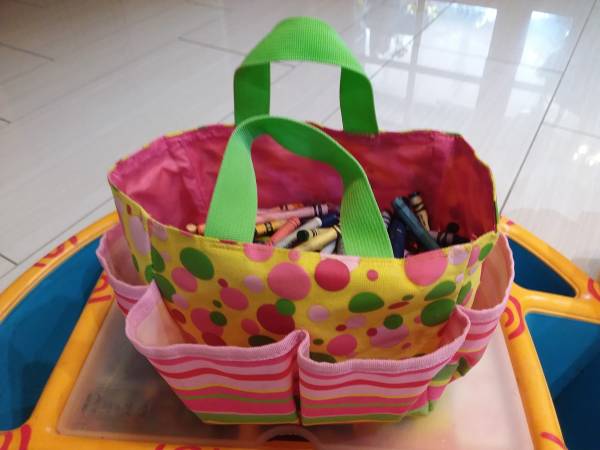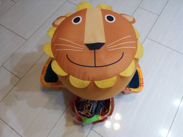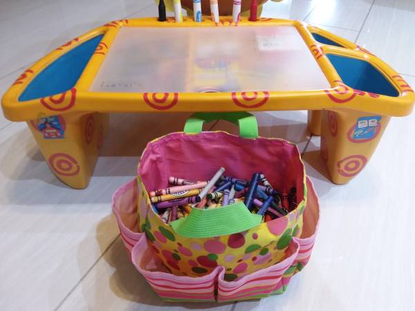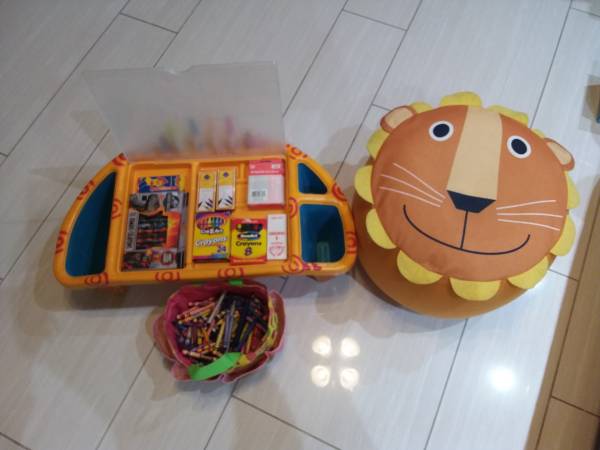 all of them in good condion . sSale for $35 The Crayon Table Orange color with clear lid and many crayon box new 23"L x 12,5"W × 8"H Colorfull Bag with lots of crayon 11"L x 6"H Lion air stool 11"H...