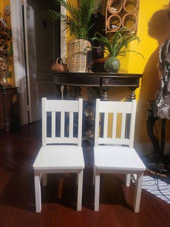 2 white chairs. Wood like materials. $10 each. Measurements in the pictures. Kid's mannequin in the last picture is $60 (necklace is not included).