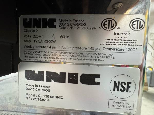 Espresso Machine UNIC Classic 2 Model CL 220 60 UNIC Was installed in a coffee truck I bought but I already have a machine. It does work, just needs a tuneup. Selling as-is! Come see it - Pickup in...