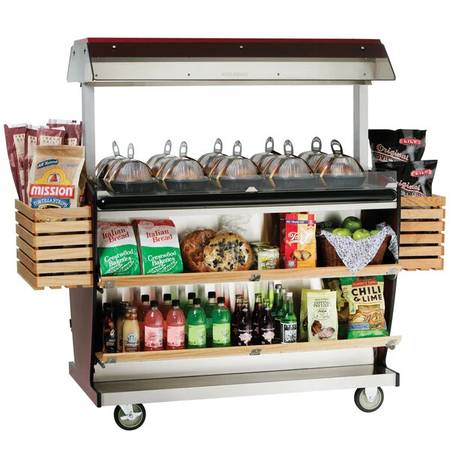 A must-have addition to any grocery or deli with takeout service, this Alto-Shaam ITM2-72/DLX deluxe island hot food merchandiser provides eye-catching looks and easy, "grab and go" access to delicious chicken, hot wings, ribs, sandwiches, and more! A sturdy, heated stainless steel base keeps foods hot and ready to serve, and a black-painted, angled overhead canopy houses (8) flood lamps to provide additional temperature control. Black Formica end panels give this merchandiser a sleek, attractive look, and its (4) wooden adjustable side shelves provide ample display space. This deluxe model also comes with (2) removable wooden baskets for keeping impulse buy merchandise close at hand! The ITM2-72/DLX requires a 120V electrical connection.