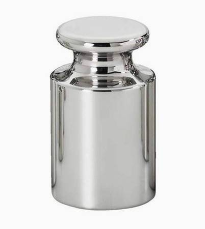 Single ASTM 1 class knob weight in a plastic box including a calibration certificate.