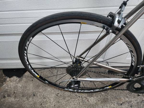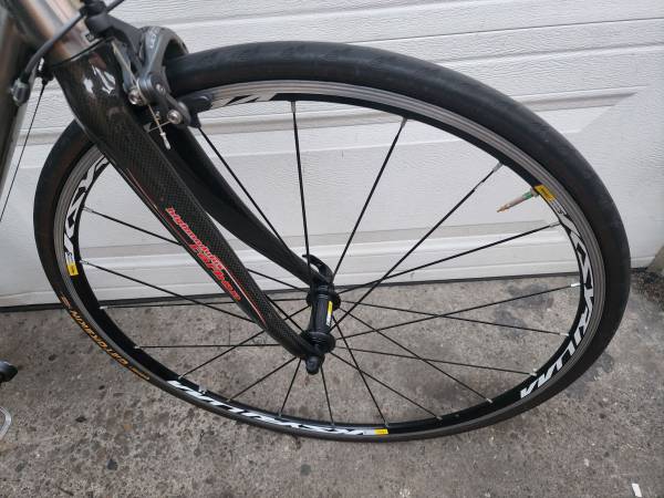 Beautiful like new condition with less than 50 mi. Size 54 cm frame. Really nice setup with the Shimano ultegra 22 speed components. Mavic Krysium wheel set. Always stored inside so it's very clean with no rest or corrosion. No scratches or dings whatsoever anywhere on the bike. All the rubber ready to go. Have all the original receipts and paperwork paid over $2,700 for the bike. We just had it professionally tuned up at our local bike shop and it rides perfect!