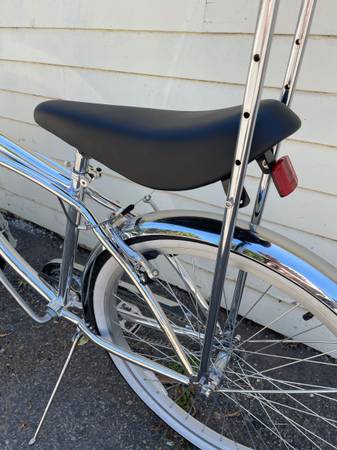 This is a brand new Lowrider Bicycle (26") by MilkBar. This bike has just been assembled and has not been ridden. Heavy metal Chromoly frame with Spring fork suspension for a ride that’s smooth like butter on a warm day. Adjustable banana seat with extra cushioning, so you don’t feel every crack in the pavement. Old-school sissy bar with lots of holes to choose your seat height, and for mounting racks and accessories. 26” white wall low-pro tires that will pound the pavement and the earth