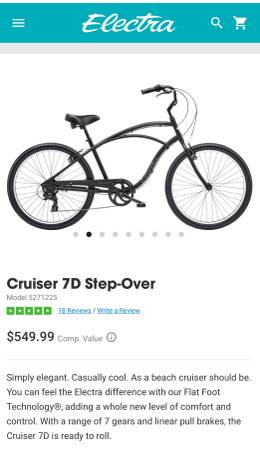 Barely used Electra Cruiser 7 bike. Excellent shape. Make me an offer! I live in Ramona now and can’t ride it. Comes with a lock. Will deliver!