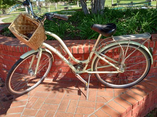 Electra Townie 24D Medium-Large Step Through Frame, 700c 38mm tires, Shimano 3x8 24spd drivetrain, fenders, rear rack, tail light, front basket.