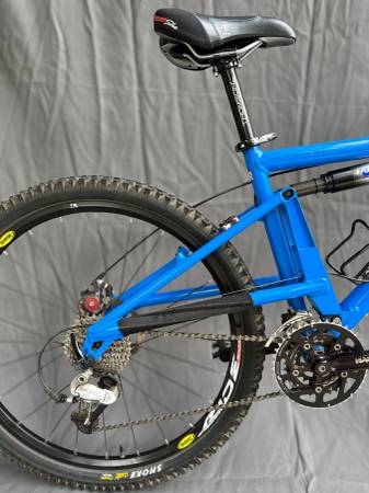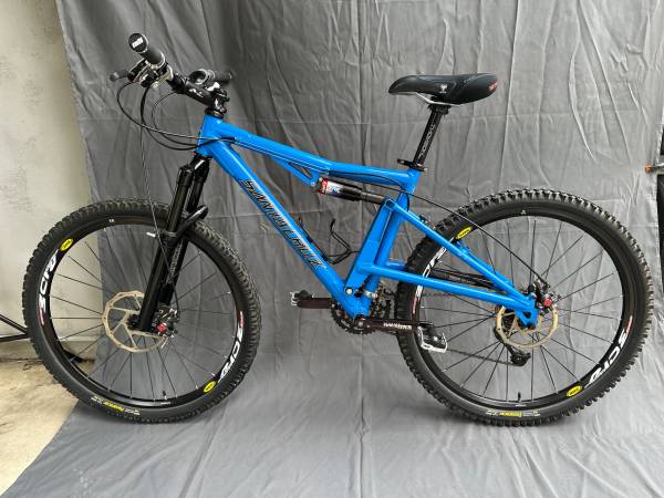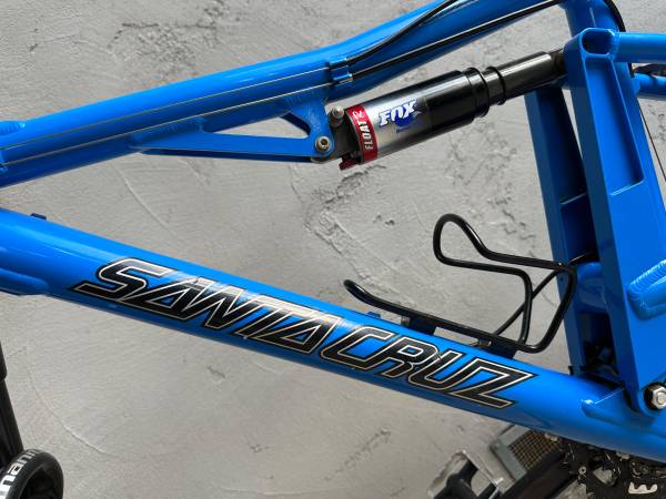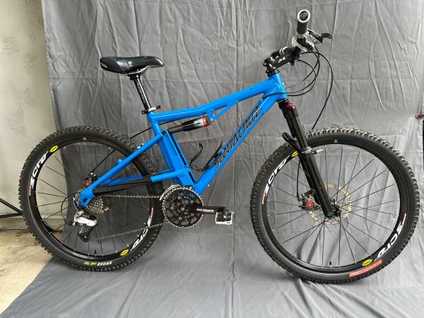 Up for grabs - An awesome early 2000s OG small Santa Cruz Superlight full suspension mountain bike, barely ridden, gorgeous blue, ready for its next life as an awesome townie for you or someone you love who deserves a special, comfy and fun townie bike. $675/OBO