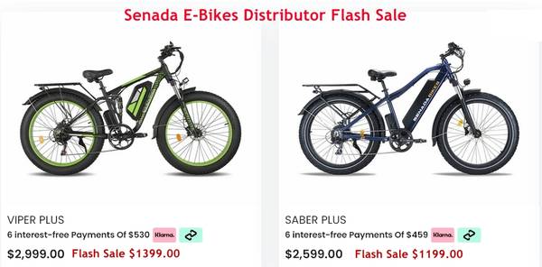 Been a Distributor for Senada E-Bikes, Electric Bikes now for 1 year and 7 month's, Due to there High demand and Sales, Manufacturer is now listing on there website there 2 most popular e-bikes the Viper Plus & Saber Plus for $2999.00 & $2599.00. As a Distributor i can still guarantee you the best price possible on those 2 Bikes.