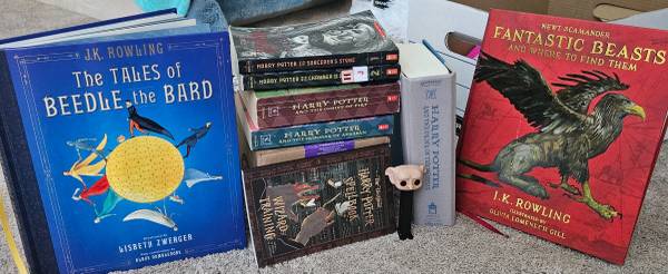 Entire set from series plus Crused Child, 2 extra hard cover Fantastic Beasts and Tales of Beedle the Bard and Harry Potter Spellbook Wizard Training $80 for all