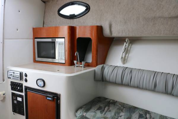 Taco outriggers, electric head, large berth, galley, bait tank, an upgraded 12-inch Raymarine Axiom Pro HybridTouch display, an upgraded Fusion Stereo system, an electric windlass, a hardtop with isinglass enclosure, new upholstery, and more.