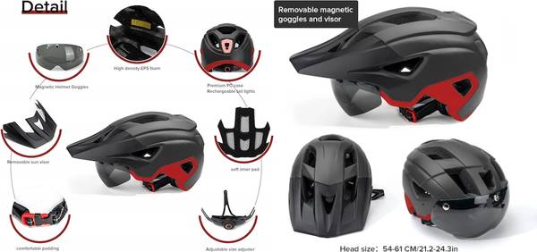 Multipurpose Detachable Goggles & Visors: Adult bike helmet magnetic goggles with USB rechargeable LED tail light - 3 lighting modes, detachable suction goggles can be used as sunglasses or face shields, effectively blocking strong light, wind, or sand.