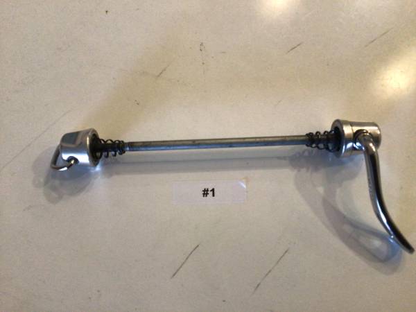 1. Campagnolo Vintage front wheel skewer. Silver. No record of model and year. Used Sparingly. Price: $35