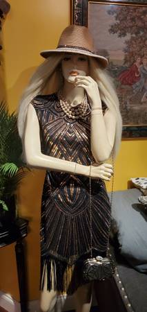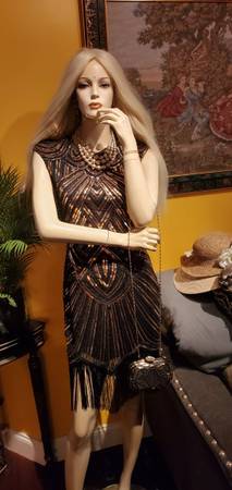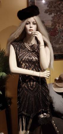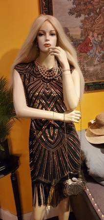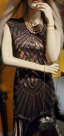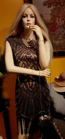 This fringed dress is classic vintage look for a modern woman. The eyecatching design features art deco print and unique vintage style which bring you back to the roaring twenties.