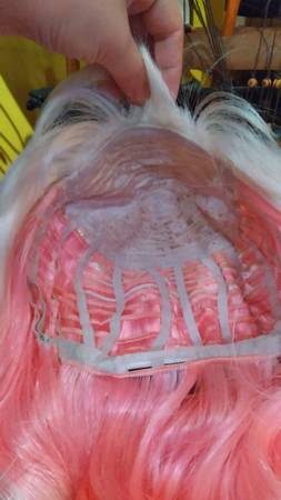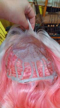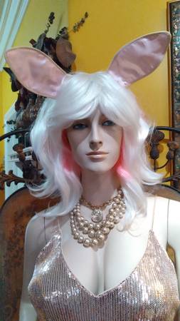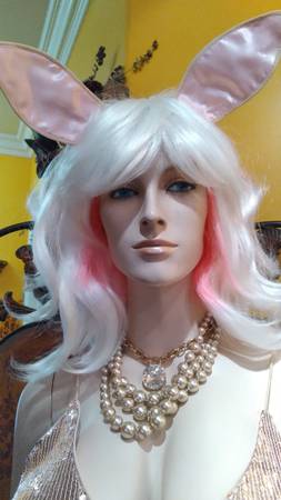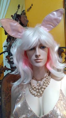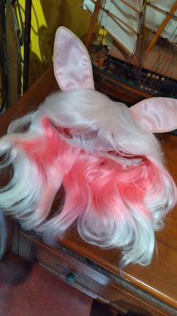 Cute Easter Bunny Synthetic Wig. Blond on top and pink on the bottom with bunny ears attached. Adult size.